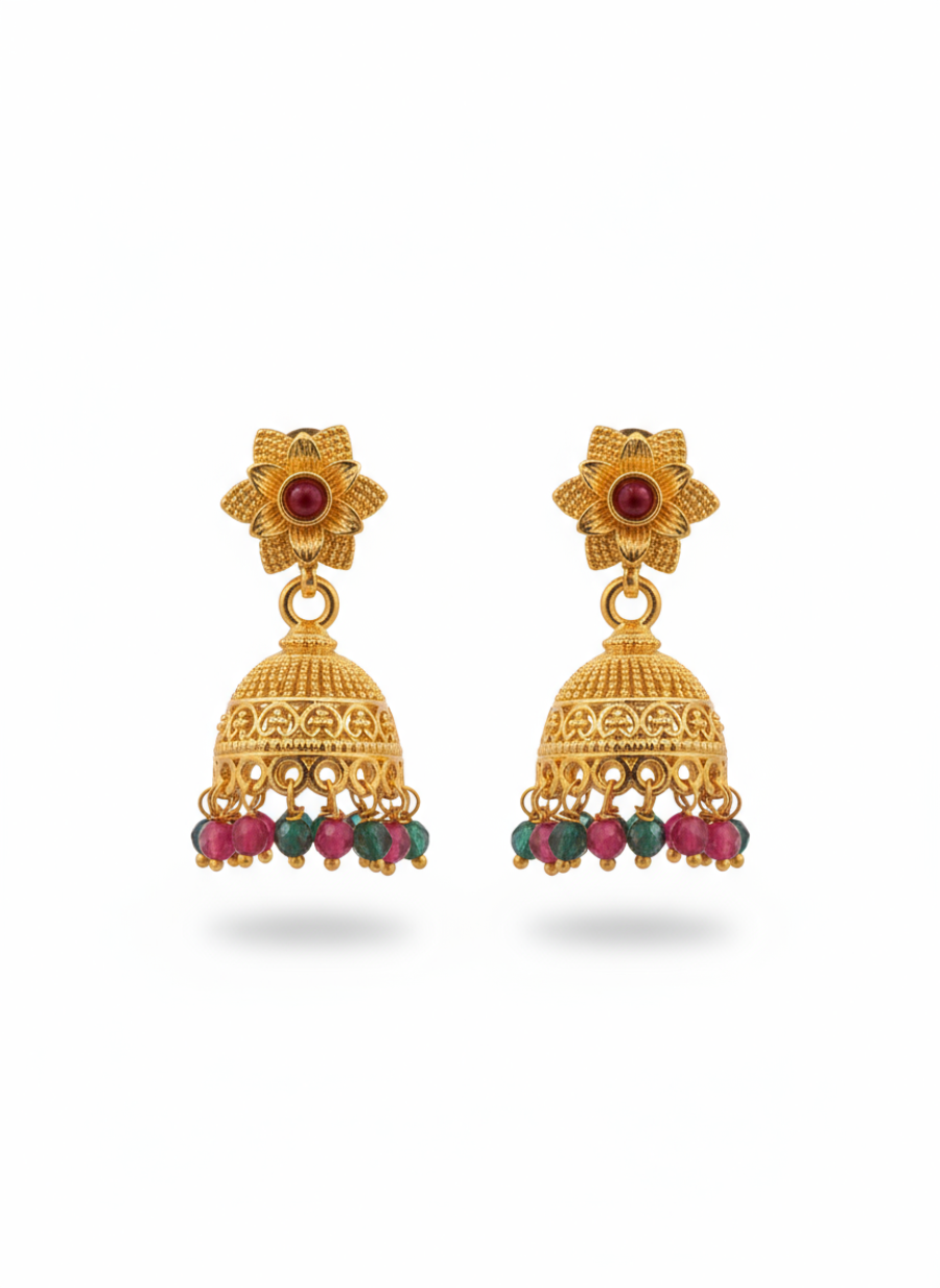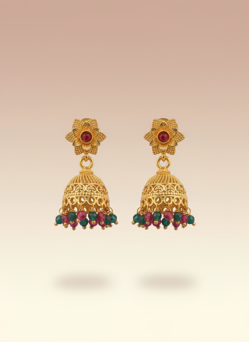 Elegant gold-plated jhumka earrings featuring intricate floral tops, dome-shaped hangings, and clusters of red and green beads, perfect for ethnic and festive occasions.
