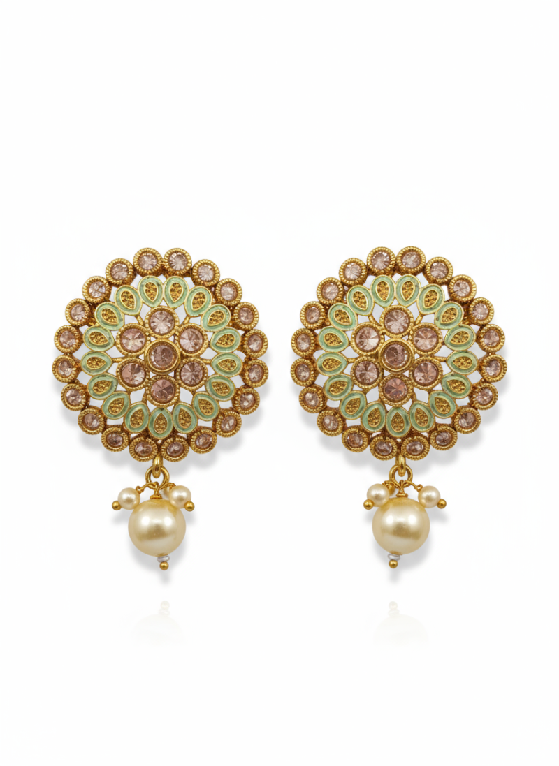 Pastel Floral Kundan Stud Earrings with Pearl Drop