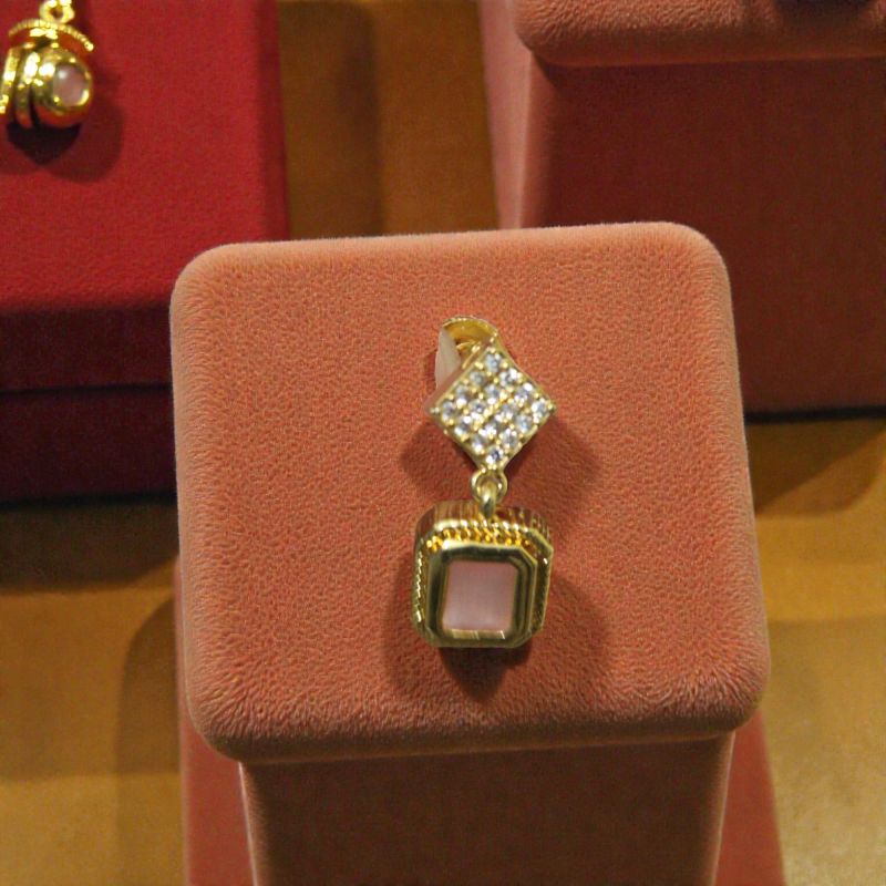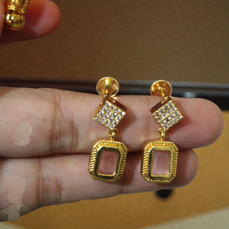 Elegant imitation drop earrings with emerald-cut rose quartz center stones framed in ornate gold-tone bezels